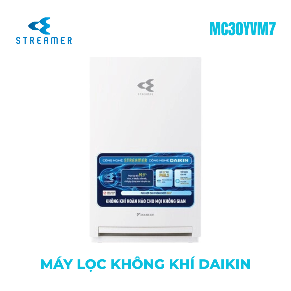 Máy lọc không khí Daikin MC30YVM7 sở hữu thiết kế hình trụ, kích thước nhỏ gọn, dễ dàng đặt ở nhiều vị trí khác nhau. Máy có màu trắng sang trọng, dễ dàng lau chùi, phù hợp không gian có diện tích 23m² đổ lại. Ngoài mẫu mã đẹp, máy còn được trang bị nhiều tính năng ưu việt, mang đến những lợi ích thiết thực như: Công nghệ Streamer độc quyền – phân hủy lên tới 99.9% virus, vi khuẩn, nấm mốc, chất gây dị ứng; Phin lọc mùi không cần thay thế có thể sử dụng trọn đời; Chế độ Haze – Lọc sạch không khí nhanh chóng; Phin lọc tĩnh điện HEPA – loại bỏ 99.98% các hạt mịn PM0.3. Tuổi thọ phin lọc Hepa lên đến 10 năm nhờ công nghệ Streamer.