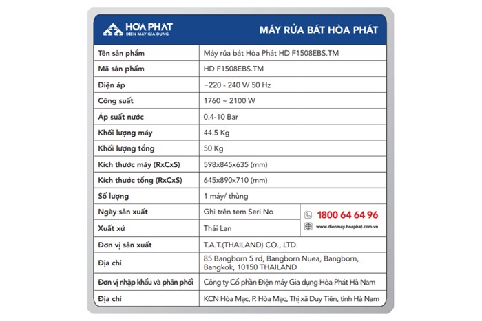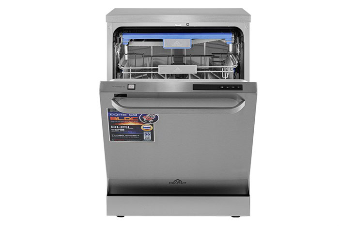 Máy rửa bát độc lập Hòa Phát HD F1508EBS TM tích hợp 8 chương trình đa dạng với nhu cầu rửa hàng ngày, công suất hoạt động 1760W – 2100W rửa được 3 – 4 bữa ăn Việt (15 bộ Châu Âu), trang bị công nghệ rửa nước nóng, tiết kiệm 50% thời gian rửa với Turbo Speed+.